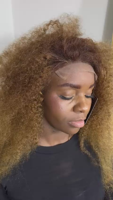 Craquez pour cette perruque bouclée ombrée caramel, douce, volumineuse et ultra-naturelle. Sa lace HD invisible offre un effet fondu parfait.